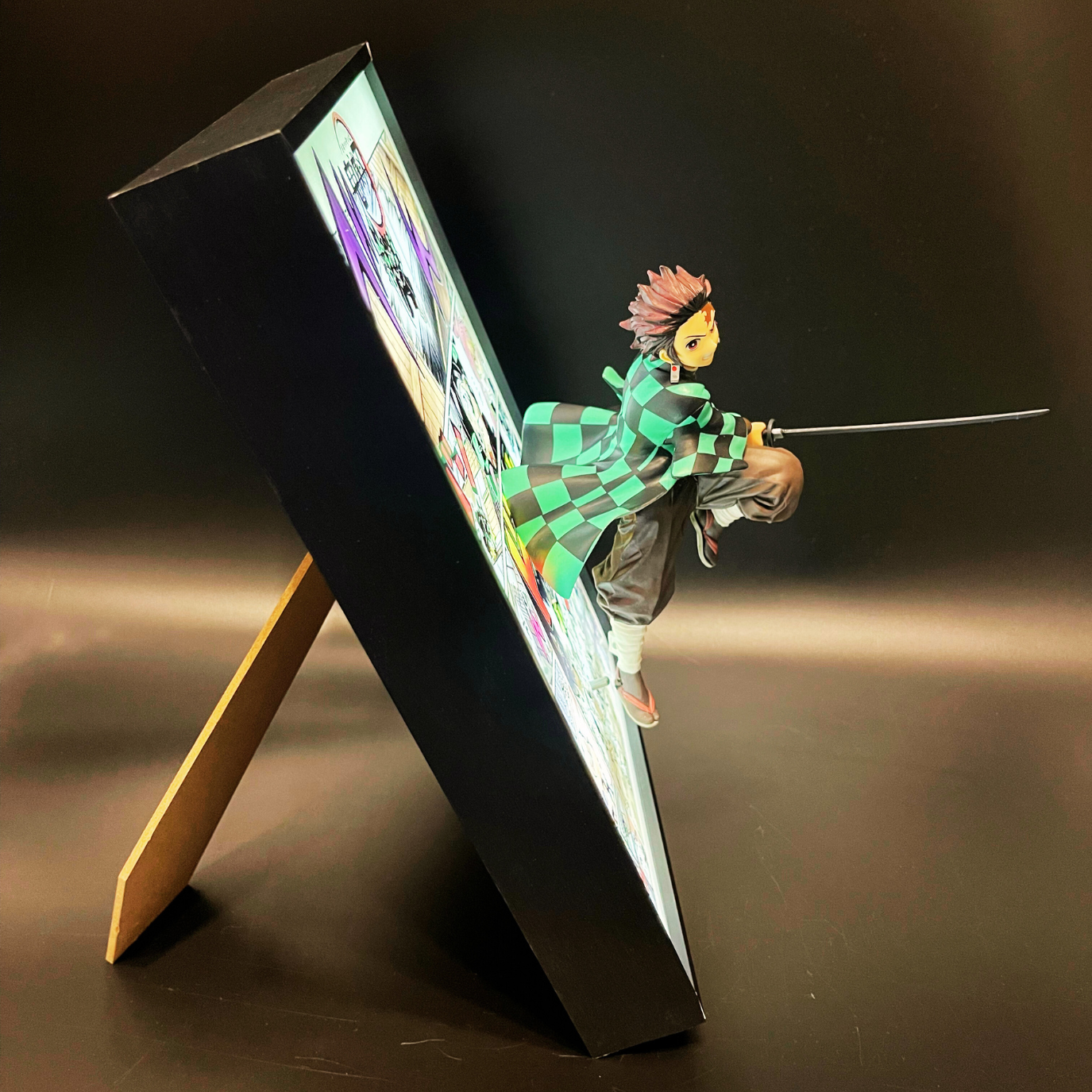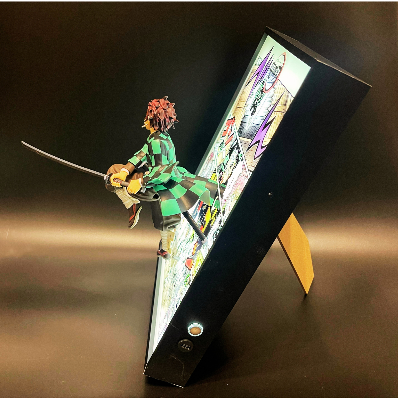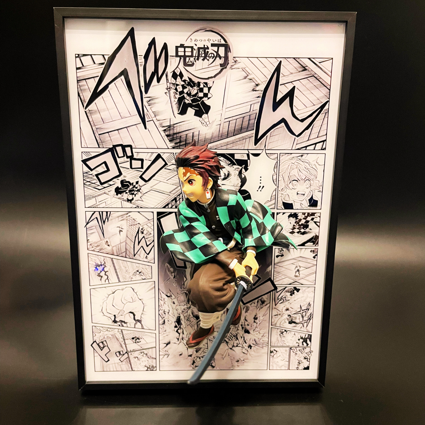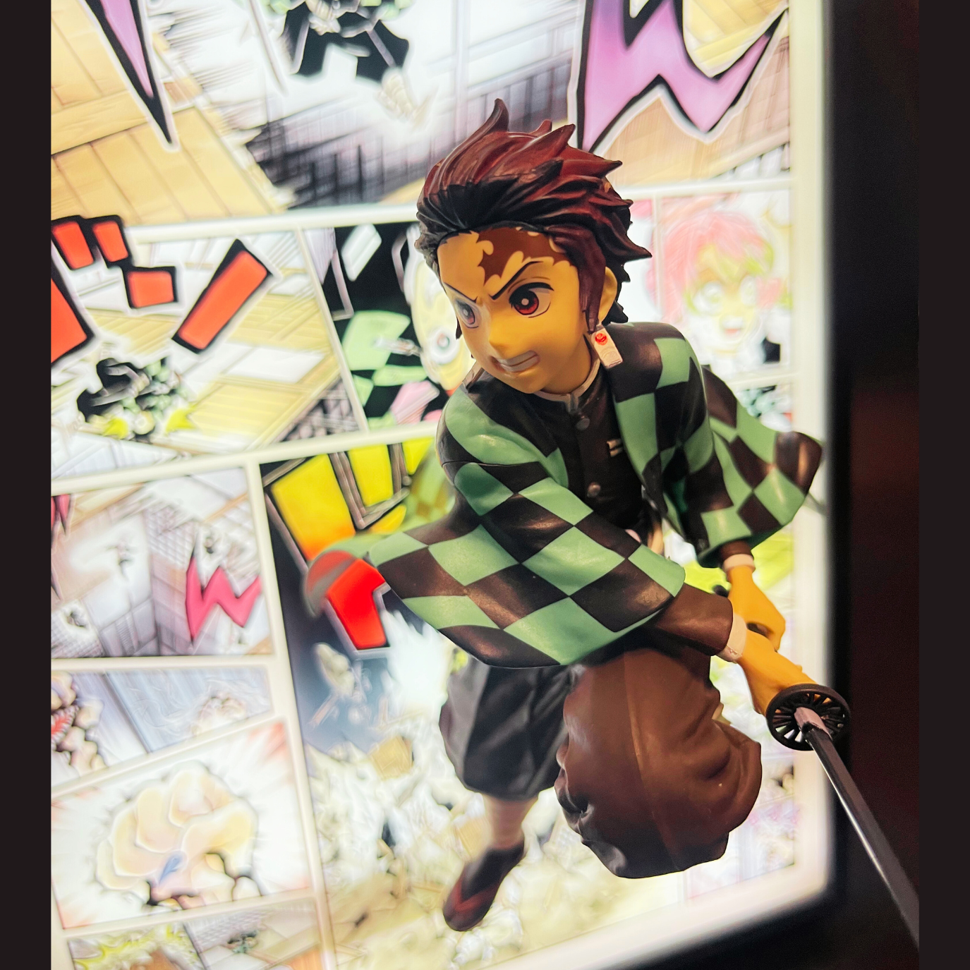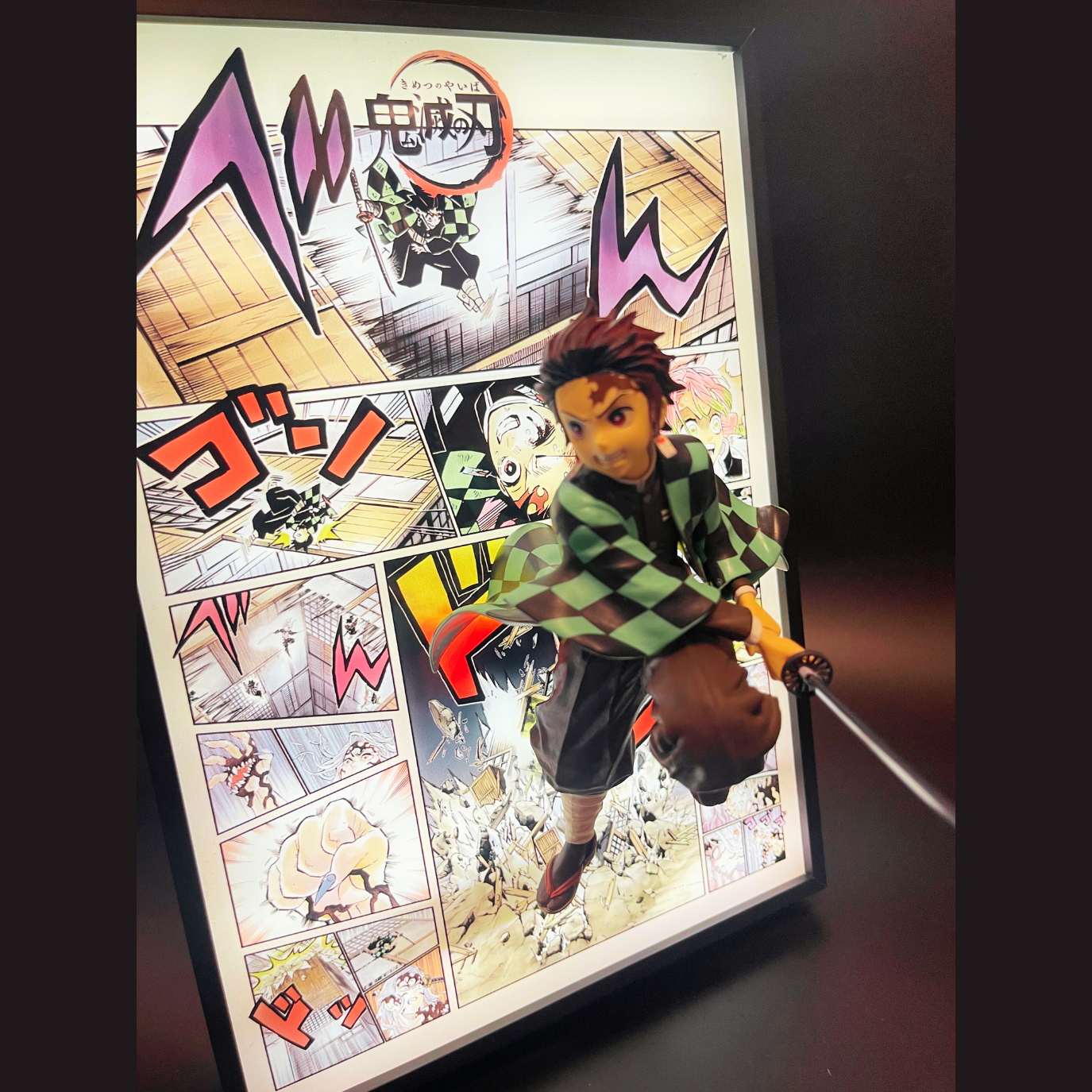 The illuminated background showcases iconic manga panels from Demon Slayer, perfectly highlighting the dramatic moment and enhancing the overall visual impact. This stunning artwork is more than just a decoration—it’s a tribute to Tanjiro’s unwavering determination and the series’ heart-pounding action.